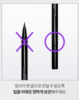 잉크가 붓 끝으로 모일 수 있도록 팁을 아래로 향하게 보관해주세요. 뒤집어서 보관하면 사용 시에 잘 나오지 않을 수 있어요.