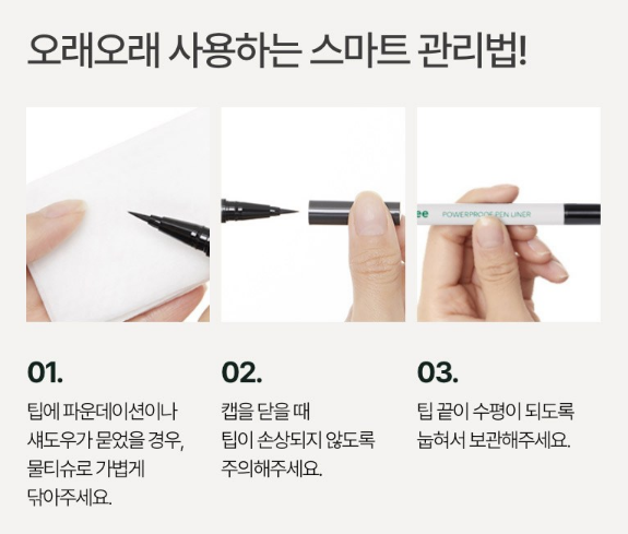 팁에 파운데이션이나 섀도우가 묻었을 경우, 물티슈로 가볍게 닦아주세요. 캡을 닫을 때, 팁이 손상되지 않도록 주의해주시고 팁 끝이 수평이 되도록 눕혀서 보관해주세요.