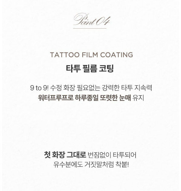 워터프루프로 하루종일 또렷한 눈매를 유지시켜주고, 첫 화장 그대로 번짐 없이 타투되어 유수분에도 거짓말처럼 착붙되어 있어요.