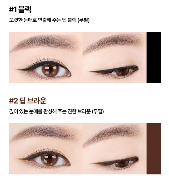바르고 난 직후, 퀵 픽싱 효과로 눈가 찍힘 현상을 줄여주면서 깔끔하고 또렷한 아이라인이 유지돼요.