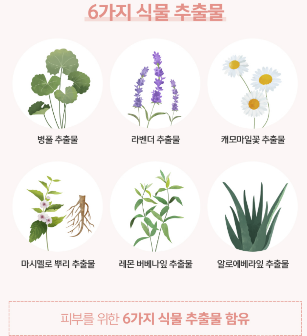 병풀 추출물, 라벤더 추출물, 캐모마일꽃 추출물, 마시멜로 뿌리 추출물, 레몬 버베나잎 추출물, 알로에베라잎 추출물 등 피부를 위한 6가지 식물 추출물이 함유되어 있어요.