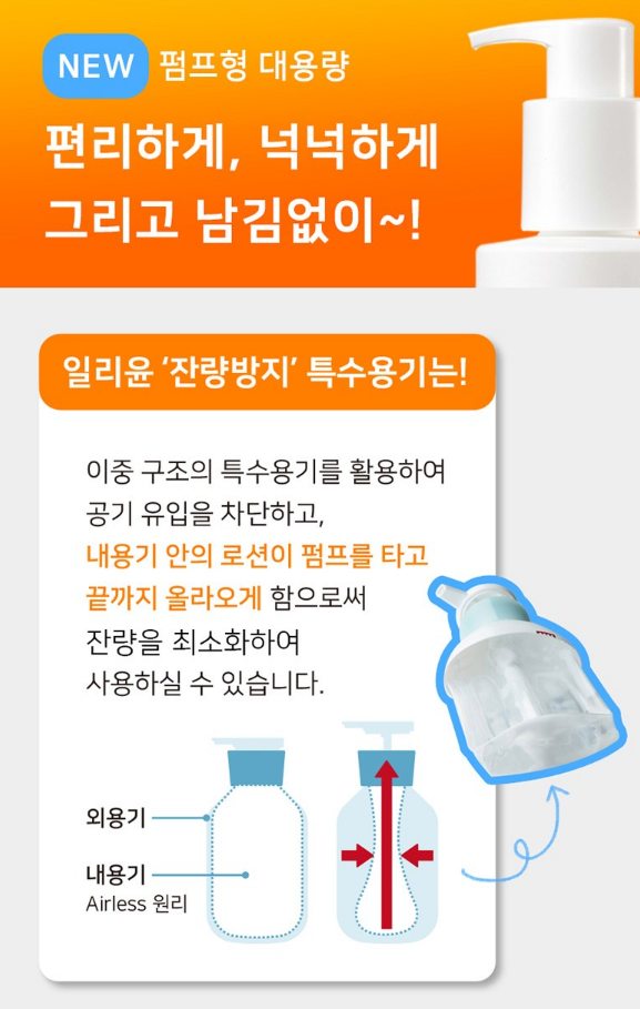 이중 구조의 특수 용기를 활용하여 공기 유입을 차단하고, 내용기 안의 로션이 펌프를 타고 끝까지 올라오게 함으로써 잔량을 최소화하여 사용할 수 있어요.
