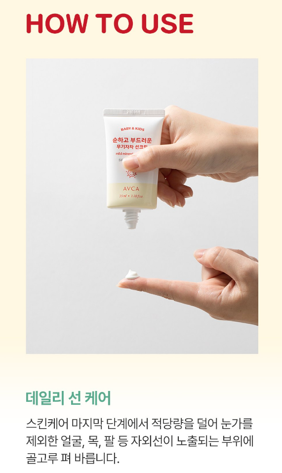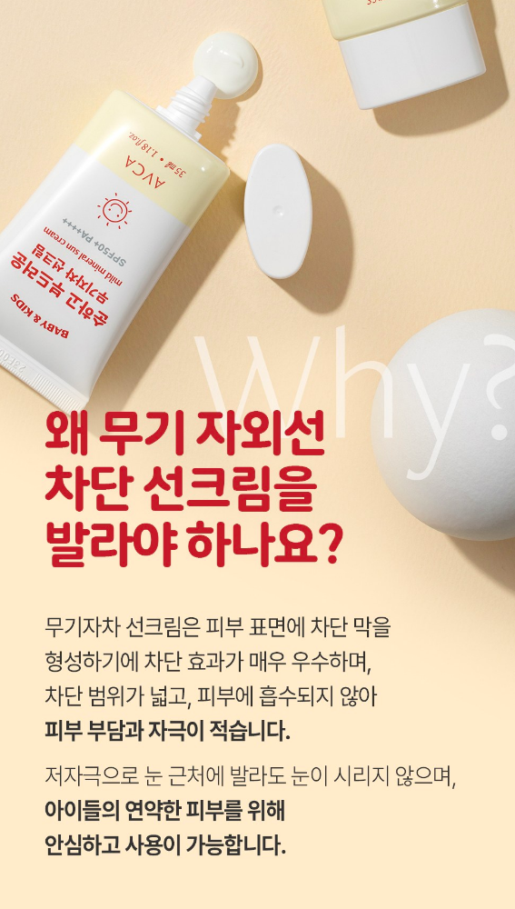 무기자차 선크림은 피부 표면에 차단 막을 형성하기에 차단 효과가 매우 우수하며, 차단 범위가 넓고, 피부에 흡수되지 않아 피부 부담과 자극이 적어요. 저자극으로 눈 근처에 발라도 눈이 시리지 않으며, 아이들의 연약한 피부를 위해 안심하고 사용이 가능해요.