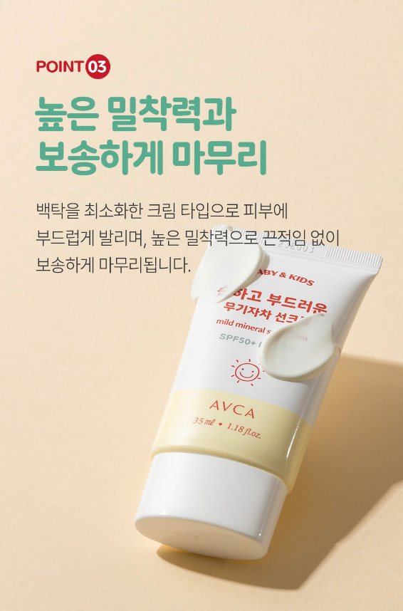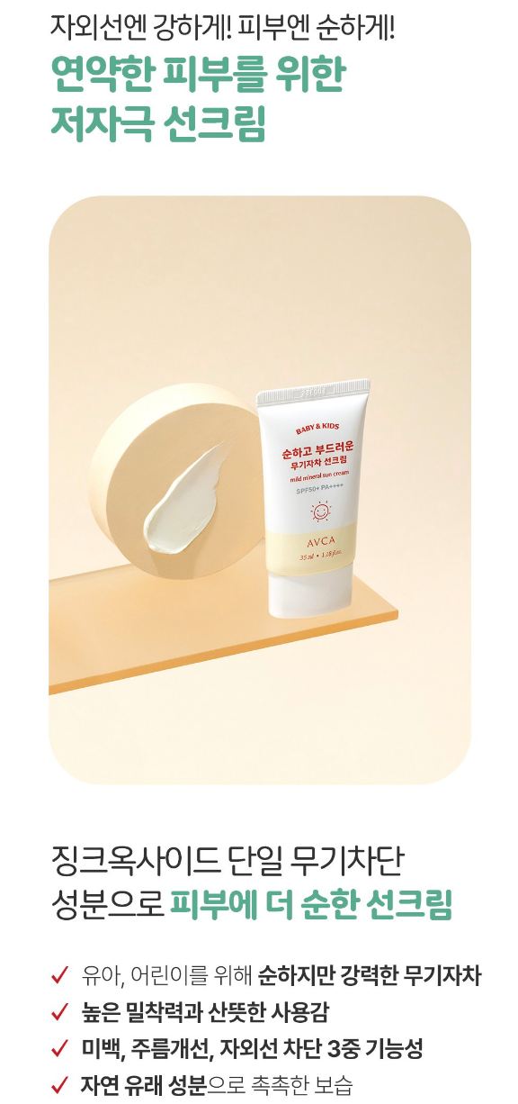 징크옥사이드 단일 무기차단 성분으로 유아, 어린이들이 안심하고 사용할 수 있는 순한 선크림이에요.