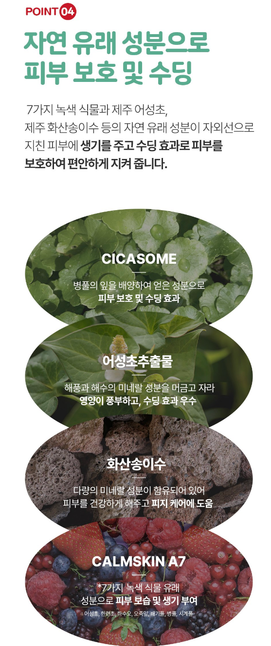 7가지 녹색 식물과 제주 어성초, 제주 화산송이수 등의 자연 유래 성분이 자외선으로 지친 피부에 생기를 주고 수딩 효과로 피부를 보호하여 편안하게 지켜 줘요.
