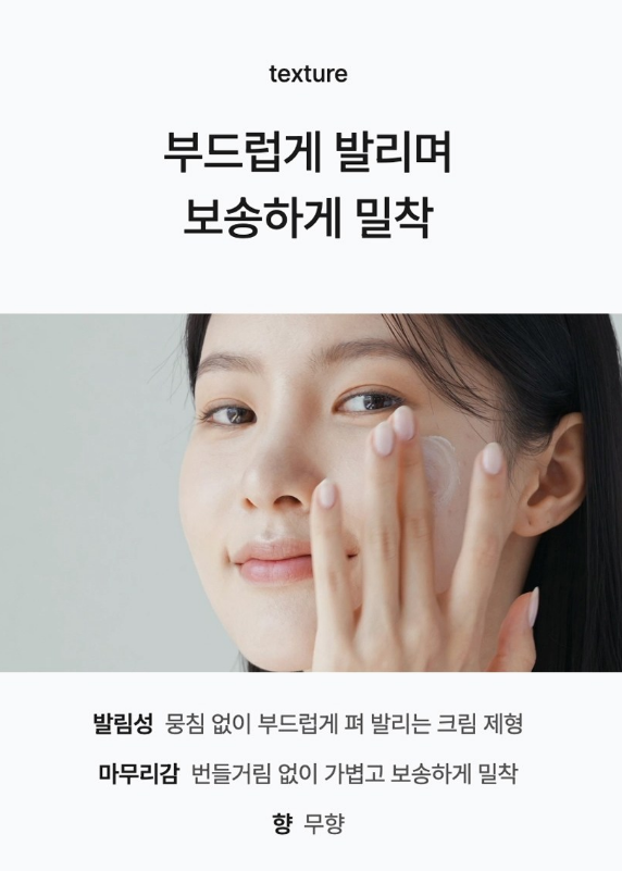 뭉침없이 부드럽게 펴 발리고 번들거림 없이 가볍고 보송하게 밀착돼요. 향도 무향이라 부담없이 사용하실 수 있어요.