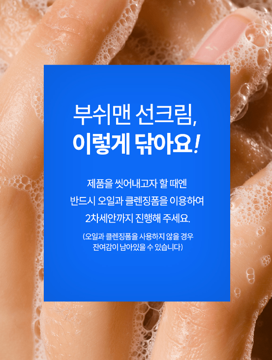 제품을 씻어내고자 할 때엔 반드시 오일과 클렌징폼을 이용하여 2차 세안까지 진행해주세요.