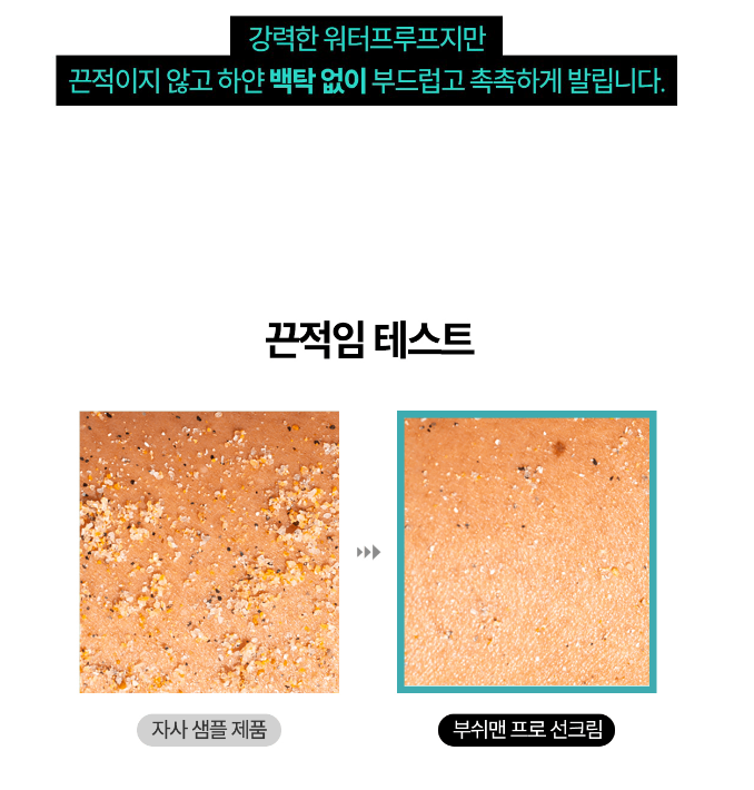 강력한 워터프루프지만 끈적이지 않고 하얀 백탁 없이 부드럽고 촉촉하게 발려요.