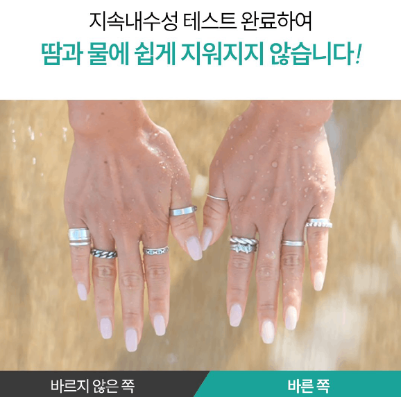 지속 내수성 테스트를 완료하여 땀과 물에 쉽게 지워지지 않아요.