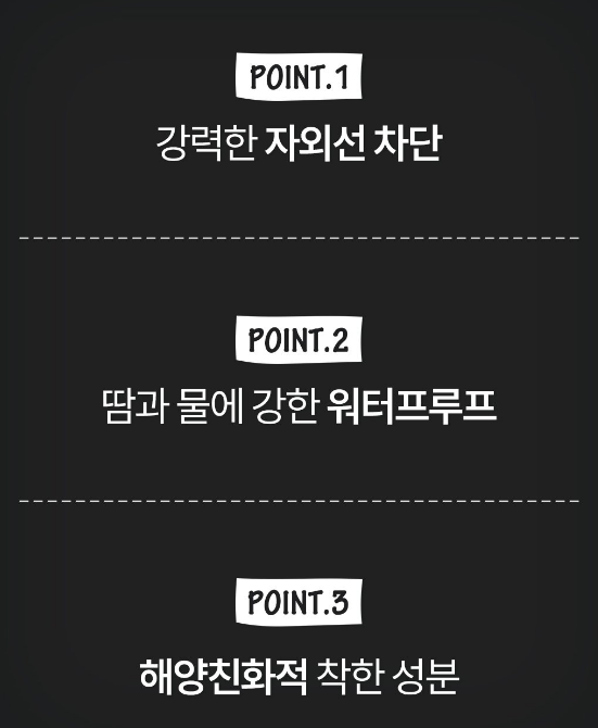 워터프루프 제품이지만 아예 씻겨나가지 않는 것은 아니기 때문에 물에서 나왔을 때 물기를 살짝 제거해주시고, 덧 발라주셔야 자외선 차단에 도움이 돼요.