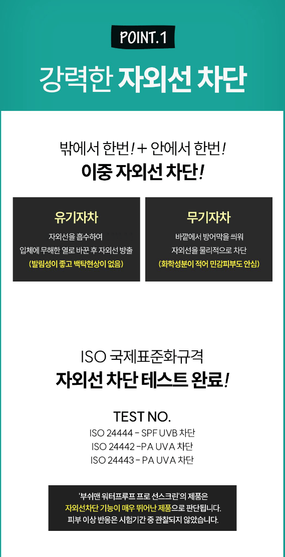 강력한 자외선 차단이 가능한 부시맨 선크림은 피부 밖에서 한 번, 안에서 한 번 UVA와 UVB를 모두 차단해요.