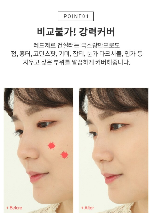 레드제로 컨실러는 극소량만으로도 점, 흉터, 고민스팟, 기미, 잡티, 눈가 다크서클, 입가 등 지우고 싶은 부위를 말끔하게 커버해줘요.
