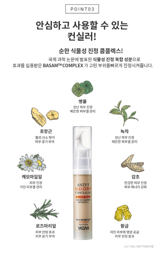 순하고 빠른 진정 효과로 특허 받은 고농축 식물성 BSASM™ COMPLEX가 울긋 불긋 고민 피부를 빠르게 진정시켜주고 흔적을 말끔히 가려주는 컨실러 제품이에요.
