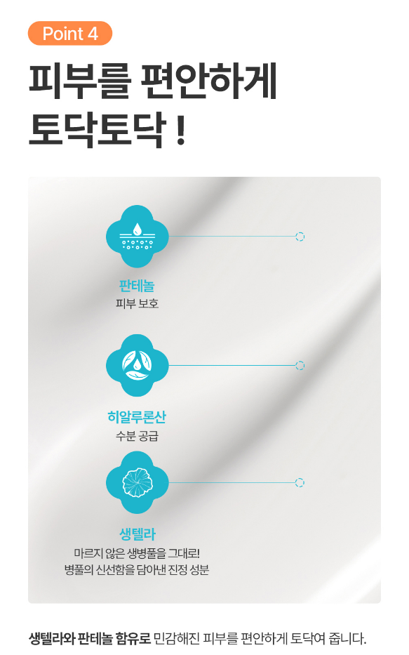 판테놀, 히알루론산, 생텔라 함유로 민감해진 피부를 진정시켜주고 보호해줘요.