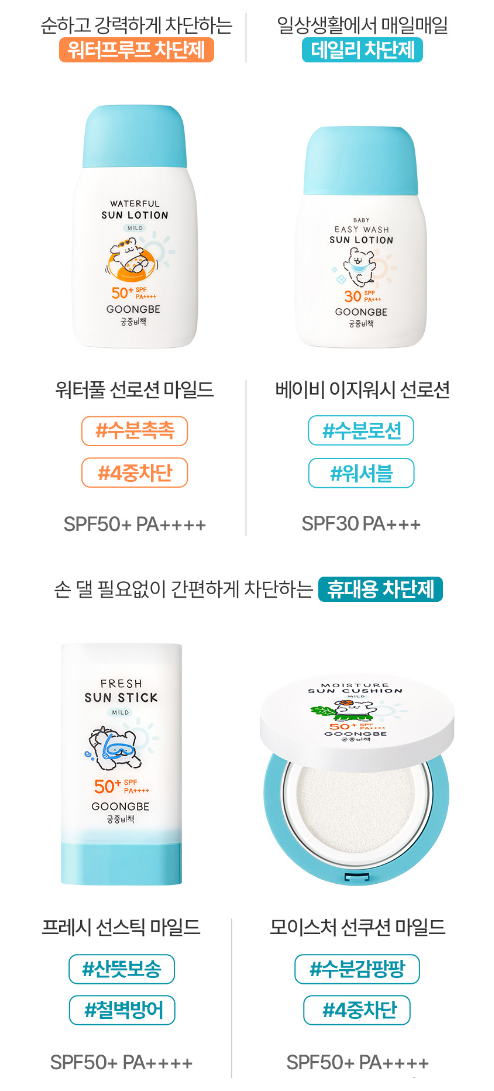 궁중비책은 선로션 외에도 워터프루프 차단기능이 있는 선로션, 선스틱, 선쿠션 등 다양한 형태의 어린이 선크림을 선보이고 있어요.