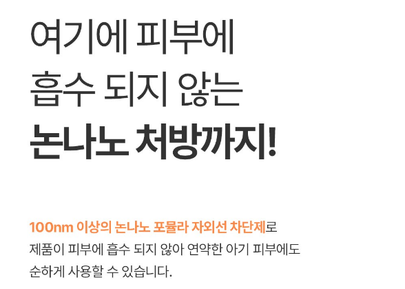 100nm 이상의 논나노 포뮬라 자외선 차단제로 제품이 피부에 흡수 되지 않아 연약한 아기 피부에도 순하게 사용할 수 있어요.