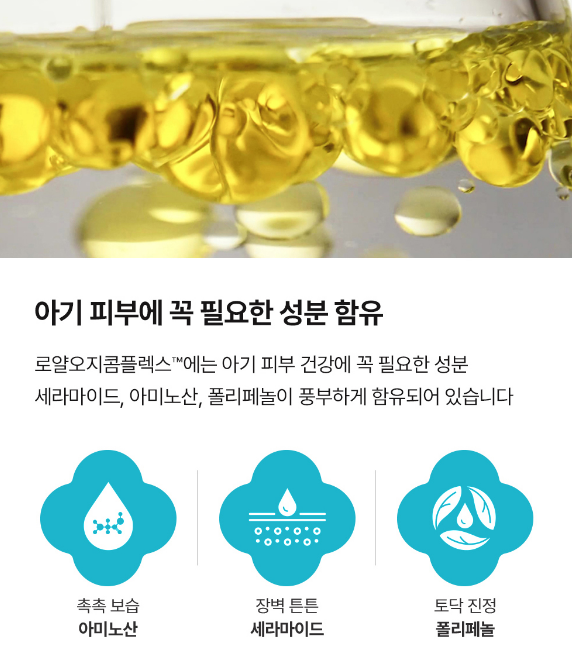 로얄오지콤플렉스에는 아기 피부 건강에 꼭 필요한 성분인 세라마이드, 아미노산, 폴리페놀이 풍부하게 함유되어 있어요.
