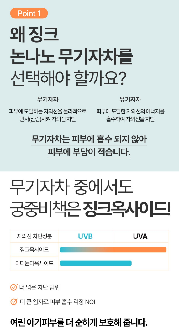 무기자차 논나노 포뮬라로 민감한 아이 피부에도 안심하고 사용 가능하다는 점이 큰 장점이에요.