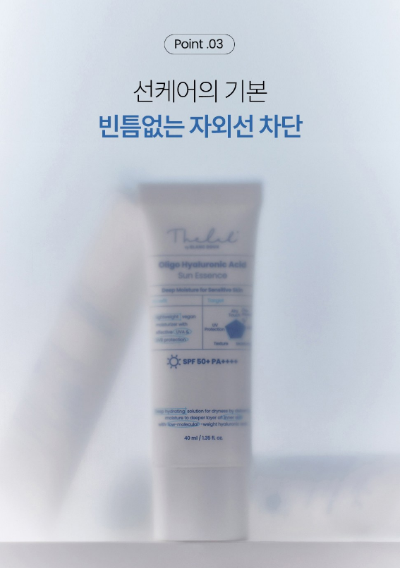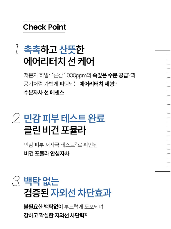 저분자 히알루론산이 피부 깊숙이 수분을 공급해주며, 마치 공기처럼 가벼운 에어리터치 제형으로 끈적임 없이 산뜻하게 마무리돼요. 백탁 없는 부드러운 발림성은 물론, 자외선 차단 효과도 임상으로 검증된 똑똑한 제품이에요. 특히 민감 피부 테스트까지 완료된 클린 비건 포뮬라라 누구나 안심하고 사용할 수 있는 에센스 선크림이랍니다.