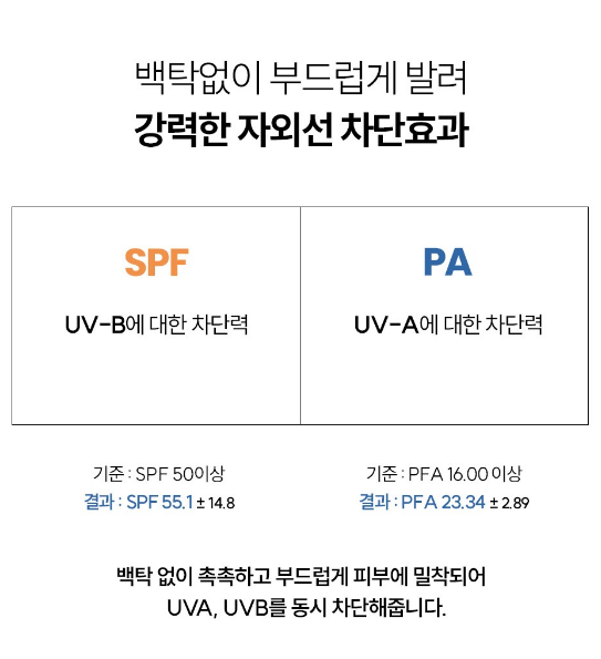 백탁 없이 촉촉하고 부드럽게 피부에 밀착되어 UVA, UVB를 동시에 차단해줘요.
