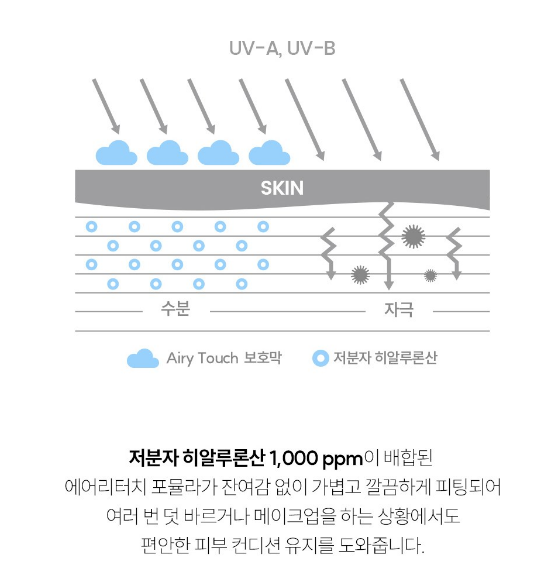 저분자 히알루론산 1000ppm이 배합된 에어리터치 포뮬라가 잔여감 없이 가볍고 깔끔하게 피팅되어 여러 번 덧바르거나 메이크업을 하는 상황에서도 편안한 피부 컨디션 유지를 도와줘요.