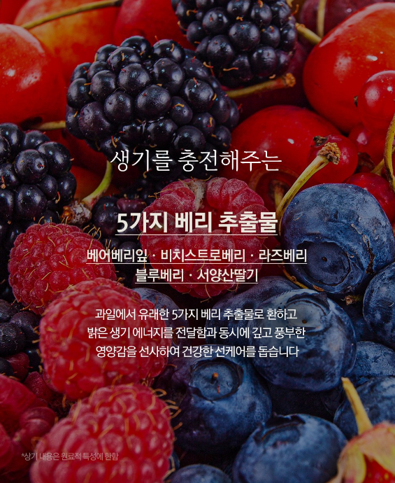 과일에서 유래한 5가지 베리 추출물로 환하고 밝은 생기 에너지를 전달함과 동시에 깊고 풍부한 영양감을 선사하여 건강한 선케어를 도와줘요.