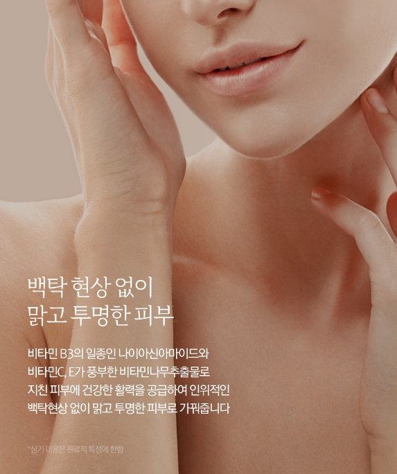비타민 B3의 일종인 나이아신아마이드와 비타민 C,E가 풍부한 비타민 나무 추출물로 지친 피부에 건강한 활력을 공급하여 인위적인 백탁현상 없이 맑고 투명한 피부로 가꿔줘요.