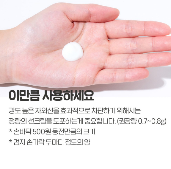 강도 높은 자외선을 효과적으로 차단하기 위해서는 손바닥 500원 동전만큼의 크기, 검지 손가락 두마디 정도의 양을 사용해주시는 것이 좋아요.