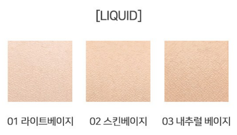 리퀴드 컨실러 컬러예요. 마찬가지로 01 라이트베이지, 02 스킨베이지, 03 내추럴 베이지로 구성되어 있어요.