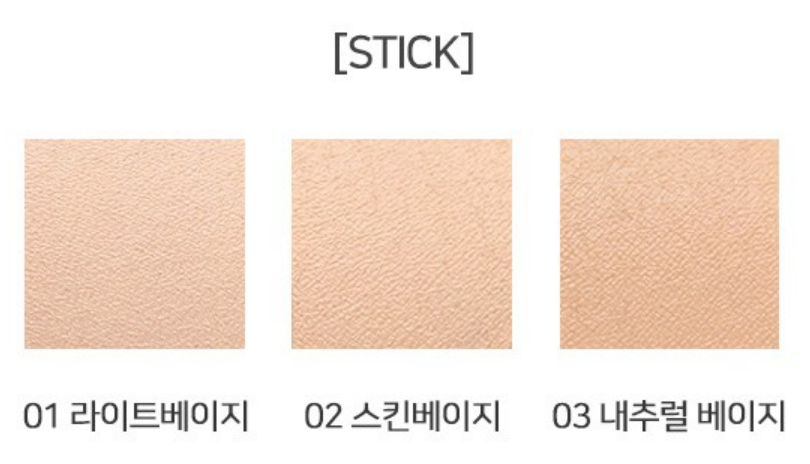 스틱 컨실러 컬러예요. 01 라이트베이지, 02 스킨베이지, 03 내추럴 베이지로 구성되어 있고 피부톤에 맞게 선택하시면 될 것 같아요!