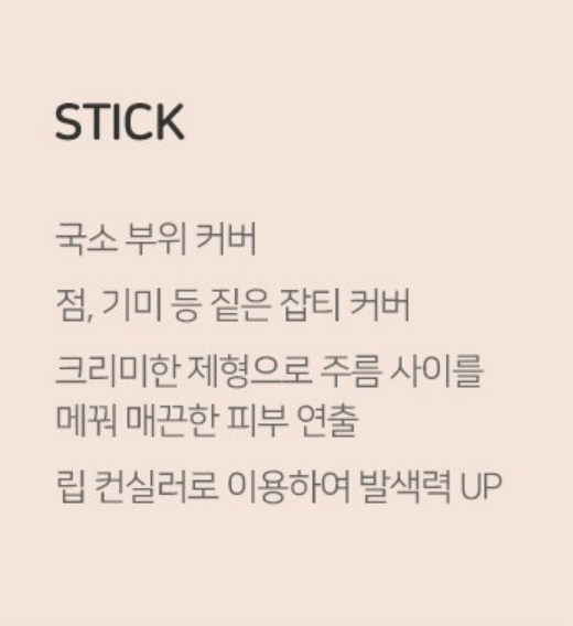 스틱 컨실러는 국소 부위 커버, 점이나 기미 등 짙은 잡티를 커버할 때 좋고, 크리미한 제형으로 주름 사이를 메꿔 매끈한 피부를 연출해줘요. 립 컨실러로 이용하여 립 제품 발색력을 높여줄 수도 있어요!