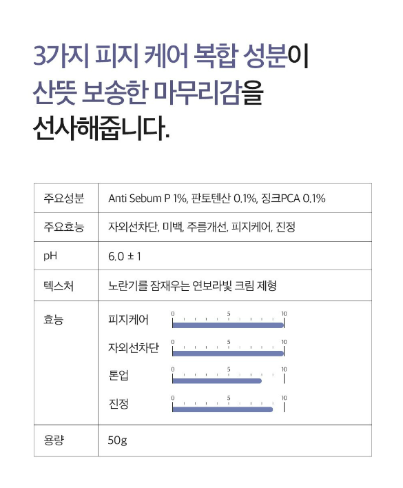 3가지 피지 케어 복합 성분이 피부에 발랐을 때 산뜻 보송한 마무리 감을 선사해줘요.