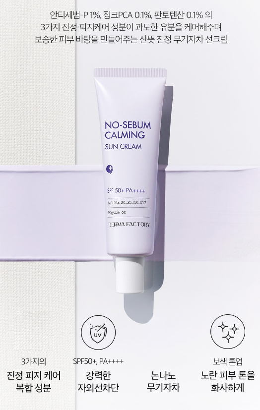 지성 선크림 찾고 계셨나요? 피지와 번들거림 때문에 선크림 선택이 고민이었다면 더마팩토리 노세범 카밍 선크림을 주목해보세요. 3가지 진정/피지 케어 복합 성분이 함유되어 번들거림을 잡아주고 강력한 자외선 차단력까지 갖춘 지성 선크림이에요.