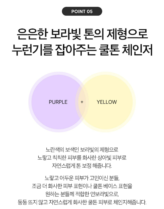 노란색의 보색인 보라빛의 제형으로 노랗고 칙칙한 피부를 화사한 상아빛 피부로 자연스럽게 톤 보정을 해줘요.