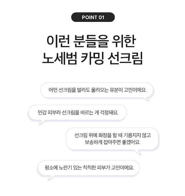 어떤 선크림을 발라도 유분이 고민이신 분, 민감한 피부이신 분, 화장을 할 때 기름지지 않고 보송하게 잡아주는 선크림을 찾고 계신 분, 평소에 노란기 있는 칙칙한 피부이신 분들께 더마팩토리 노세범 카밍 선크림을 추천해요.
