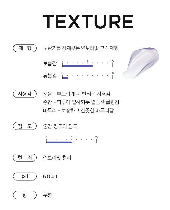 노란기를 잠재는 연보라빛 크림 제형으로 처음에는 부드럽게 펴발리고 마무리는 보송하고 산뜻하게 마무리 돼요.