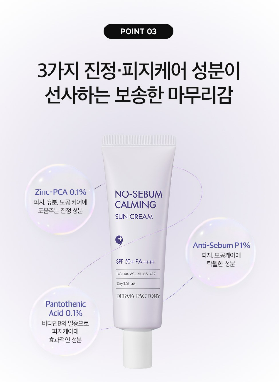 더마팩토리 노세범 카밍 선크림은 안티세범-P 1%, 징크PCA 0.1%, 판토텐산 0.1%의 3가지 진정 및 피지 케어 성분이 과도한 유분을 케어해주며 보송한 피부 바탕을 만들어주는 산뜻 진정 무기자차 선크림이에요.