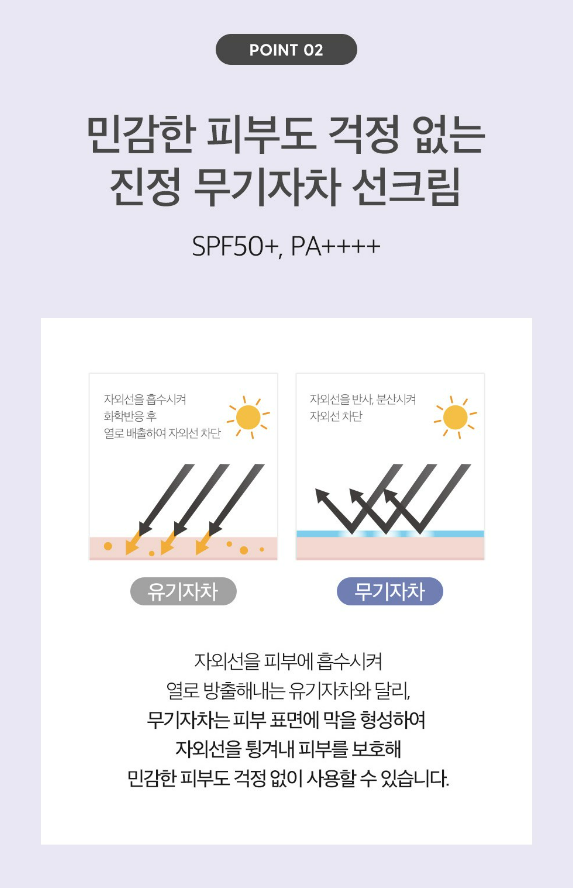 자외선을 피부에 흡수시켜 열로 방출해내는 유기자차와 달리, 무기자차는 피부 표면에 막을 형성하여 자와선을 튕겨내 피부를 보호해 민감한 피부도 걱정 없이 사용할 수 있어요.