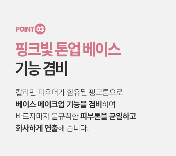 칼라민 파우더가 함유된 핑크톤으로 베이스 메이크업 기능을 겸비하여 바르자마자 불규칙한 피부톤을 균일하고 화사하게 연출해줘요.