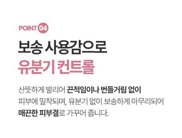 번들거림 없이 보송하게 마무리되어 지복합성 피부에 특히 적합해요.