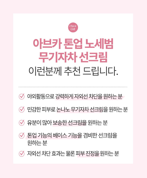 야외활동으로 강력하게 자외선 차단을 원하는 분, 민감한 피부로 논나노 무기자차 선크림을 원하는 분, 유분이 많아 보송한 선크림을 원하는 분, 톤업 기능의 베이스 기능을 겸비한 선크림을 원하는 분, 자외선 차단 효과는 물론 피부 진정을 원하는 분들께 아브카 톤업 노세범 선크림을 추천해요.