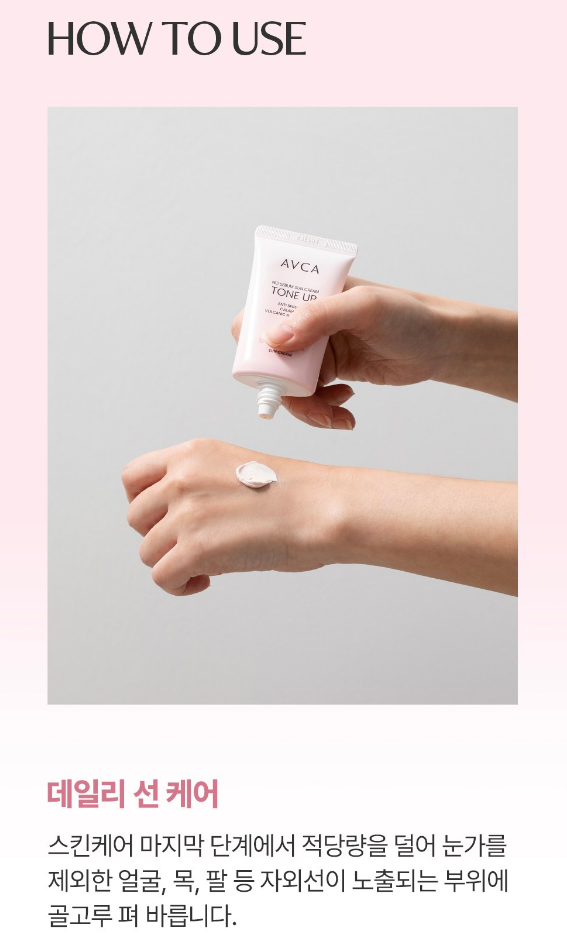 스킨케어 마지막 단계에서 적당량을 덜어 눈가를 제외한 얼굴, 목, 팔 등 자외선이 노출되는 부위에 골고루 펴 발라 주세요.