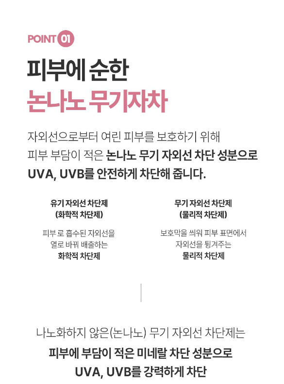 자외선으로부터 여린 피부를 보호하기 위해 피부 부담이 적은 논나노 무기 자외선 차단 성분으로 UVA, UVB를 안전하게 차단해줘요.