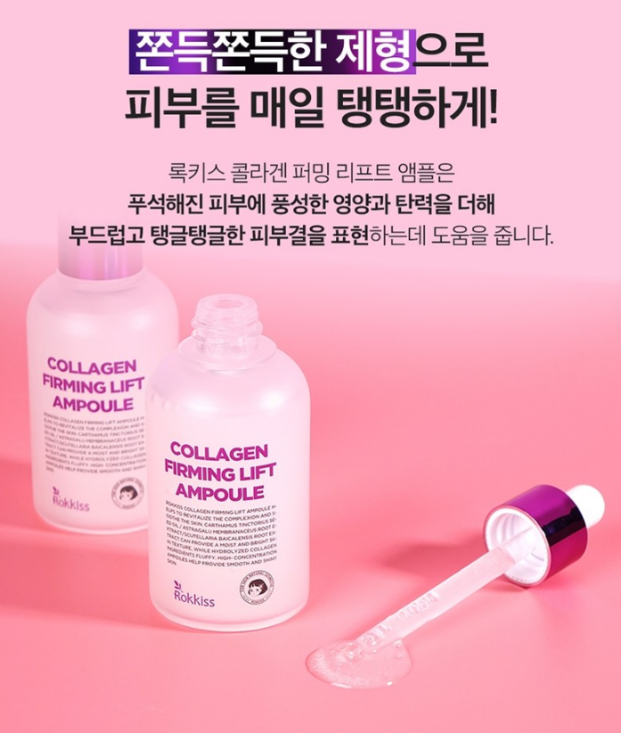 록키스 콜라겐 퍼밍 리프트 앰플은 쫀득쫀득한 제형으로 푸석해진 피부에 풍성한 영양과 탄력을 더해 부드럽고 탱글탱글한 피부결을 표현하는데 도움을 줘요.
