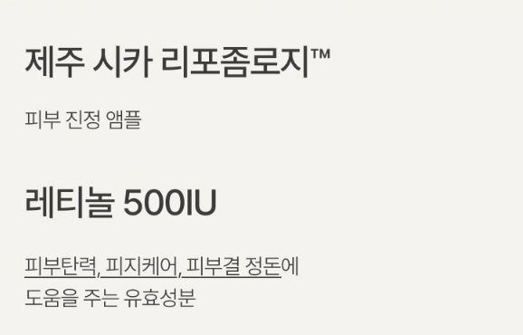 제주 시카 리포좀로지로 피부 진정을 돕고, 레티놀 500IU로 피부탄력, 피지케어 및 피부결 정돈에 도움을 준답니다.