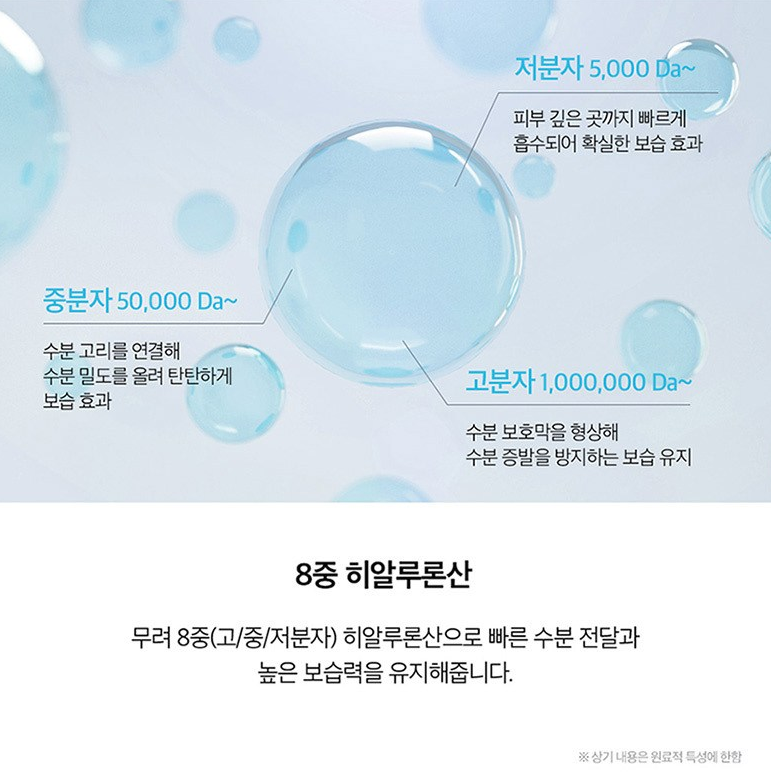 8중(고/중/저분자) 히알루론산으로 빠른 수분 전달과 높은 보습력을 유지해줘요. 고분자(1,000,000 Da~)는 수분 보호막을 형상해 수분 증발을 방지, 보습을 유지해주고 중분자(50,000 Da~)는 수분 고리를 연결해 수분 밀도를 올려 탄탄하게 보습 효과를 주며, 저분자(5,000 Da~)는 피부 깊은 곳까지 빠르게 흡수되어 확실한 보습 효과를 준답니다!