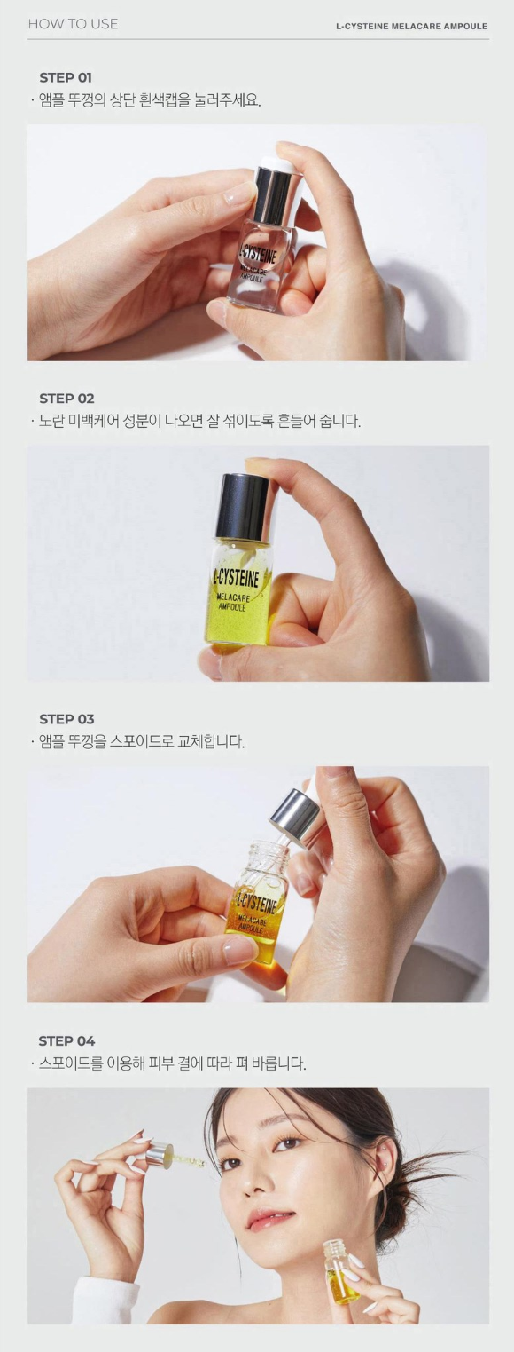 앰플 뚜껑 상단 흰색캡을 눌러주고, 노란 미백케어 성분이 나오면 잘 섞이도록 흔들어주세요. 그리고 앰플 뚜껑을 스포이드로 교체하고 스포이드를 이용해 피부 결에 따라 펴 바르시면 된답니다!