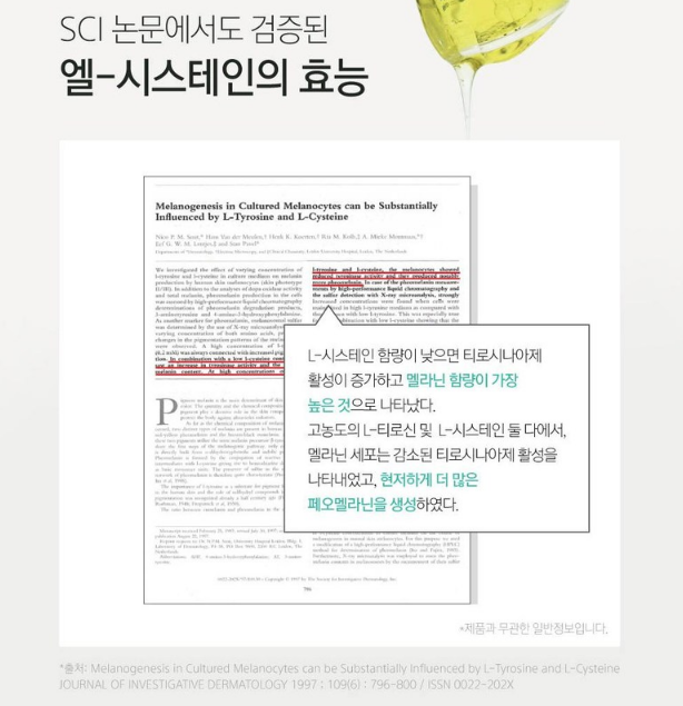 SCI 논문에서도 엘-시스테인 효능이 검증되었는데요. 엘-시스테인 함량이 낮으면 티로시나아제 활성이 증가하고 멜라닌 함량이 가장 높은 것으로 나타났으며, 고농도의 엘-티로신 및 엘-시스테인 둘 다에서 멜라닌 세포는 감소된 티로시나아제 활성을 나타내고 현저하게 많은 페오멜라닌을 생성했다고 밝혀졌다고해요.