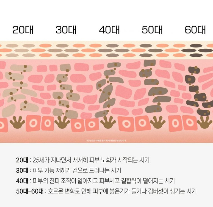 20대 때는 25세가 지나면서 서서히 피부 노화가 시작되고, 30대에는 피부 기능 저하가 겉으로 드러나며, 40대는 피부의 진피 조직이 얇아지고 피부세포 결합력이 떨어지고, 50-60대는 호르몬 변화로 인해 피부에 붉은기가 돌거나 검버섯이 생기게 돼요.