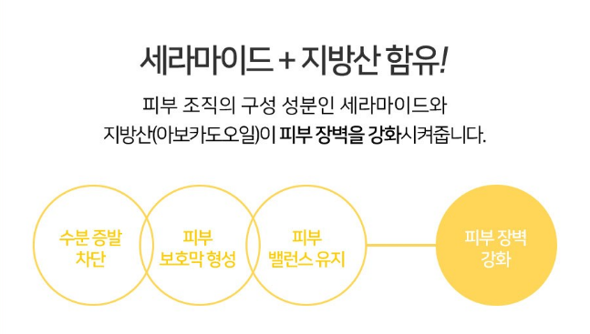 피부 조직의 구성 성분인 세라마이드와 지방산(아보카도오일)이 피부 장벽을 강화시켜줘요. 수분 증발 차단, 피부 보호막 형성, 피부 밸런스 유지를 통해 피부 장벽을 강화시키는 거랍니다.